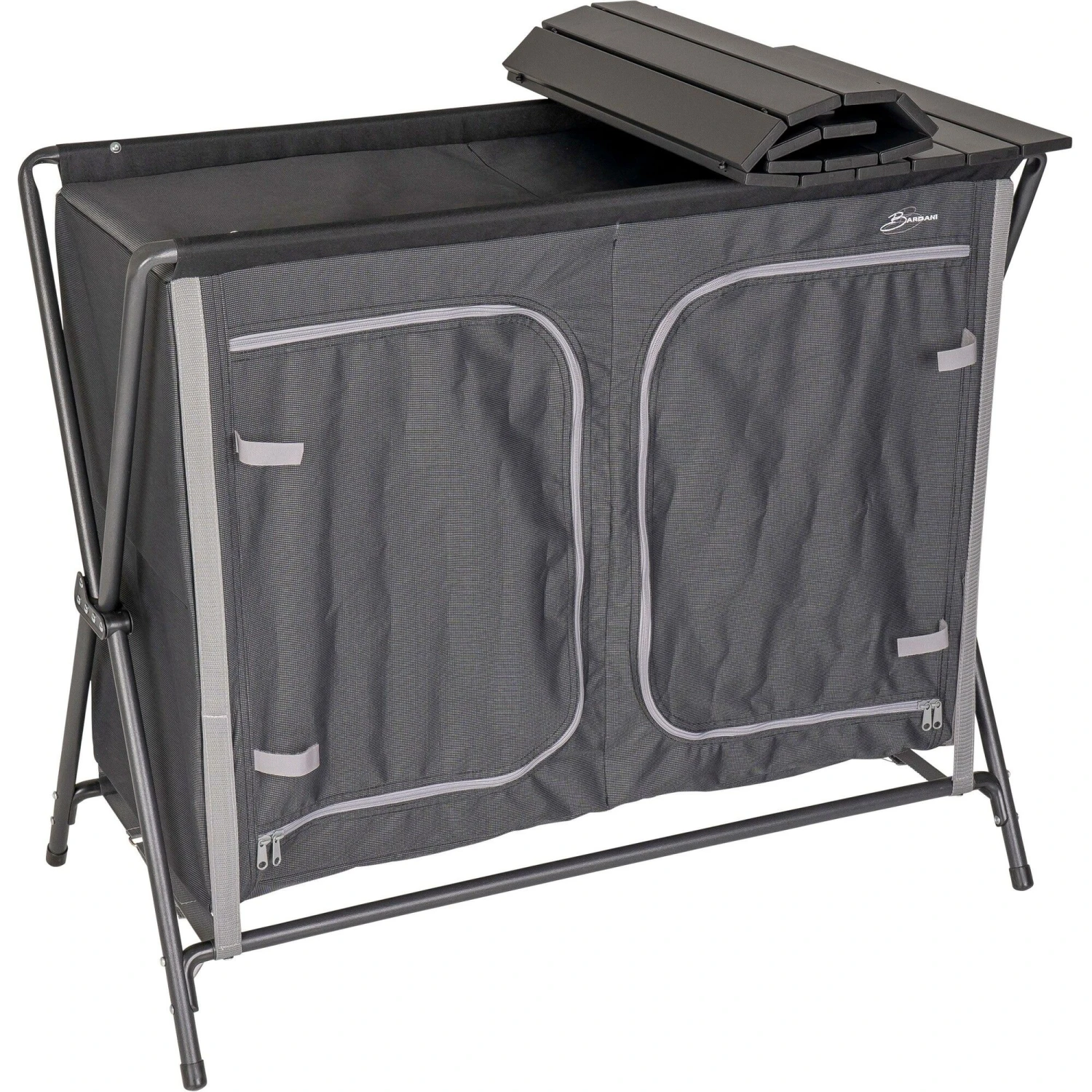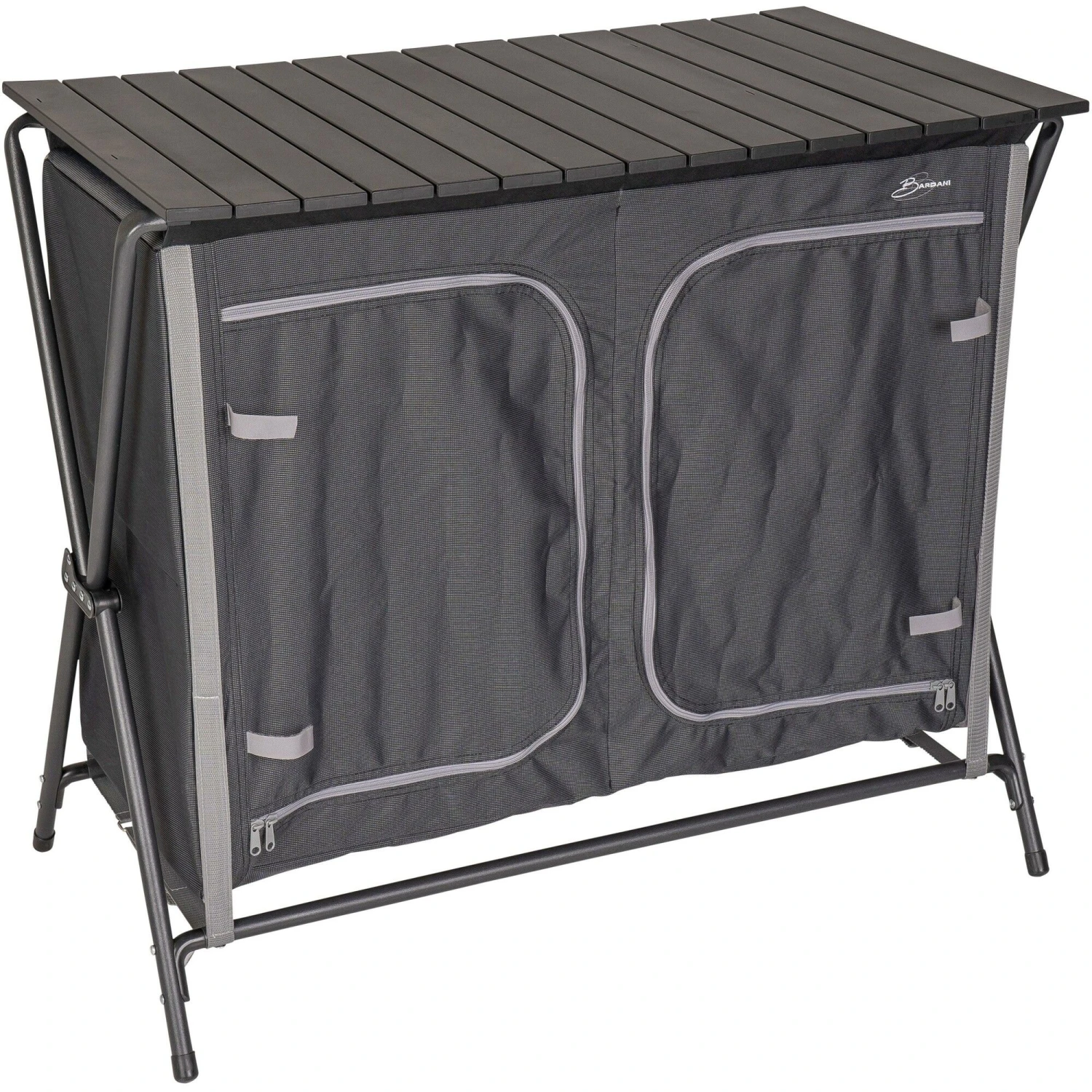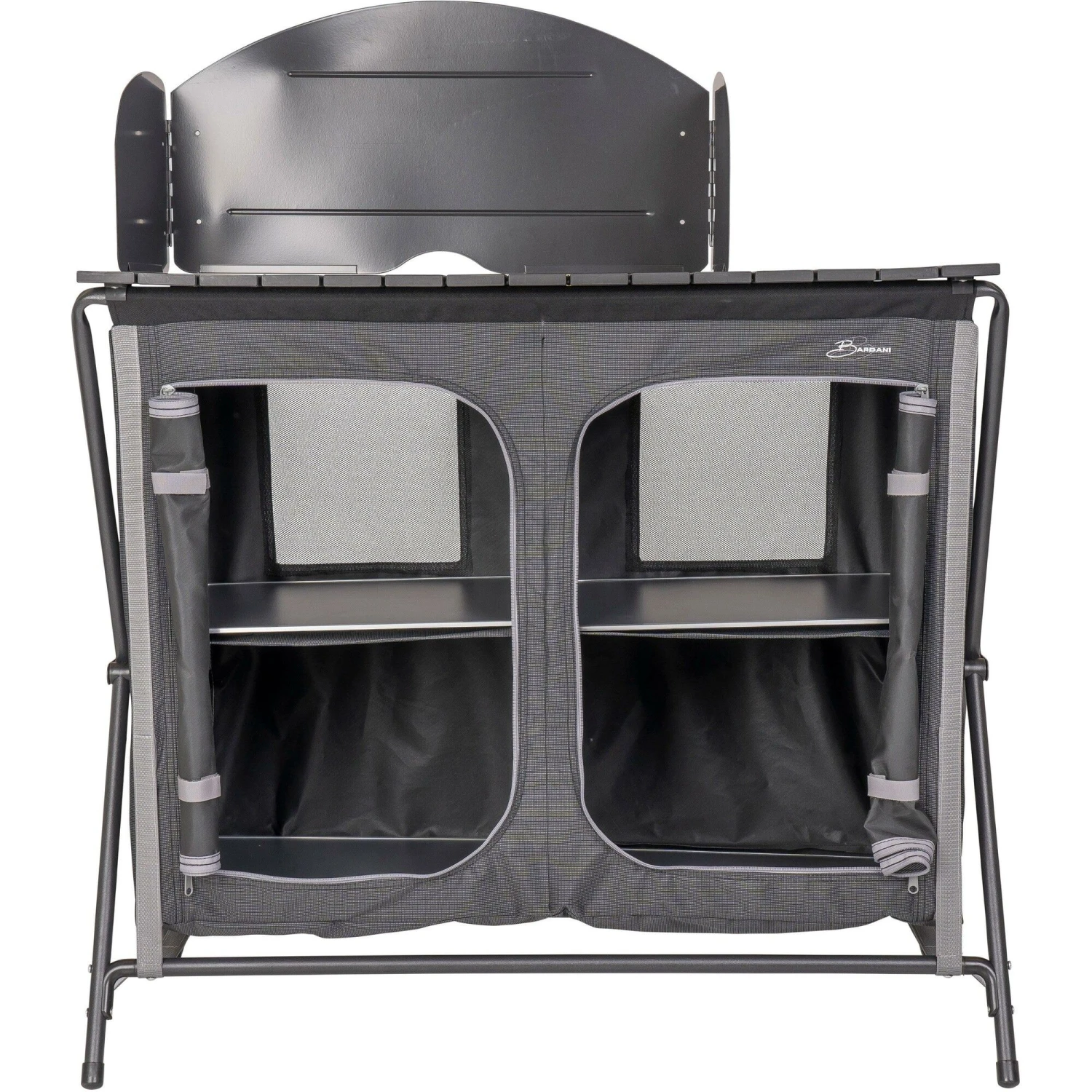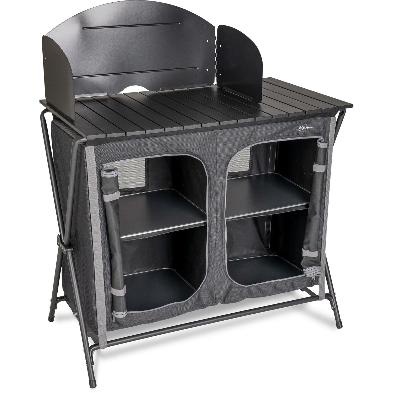 De Bardani Bollitura X4 kampeerkeuken brengt uw comfort van thuis naar de camping. Deze Bardani kampeerkeuken is voorzien van 2 x 2 schappen, waarin u al uw kookspullen kwijt kunt. De campingkeuken is inklapbaar en kan hierdoor gemakkelijk vervoerd worden. Daarnaast is de campingkeuken voorzien van een oprolbaar keukenblad en een metalen windscherm. Het frame is gemaakt van aluminium. Dit maakt de keuken zeer stevig en licht.