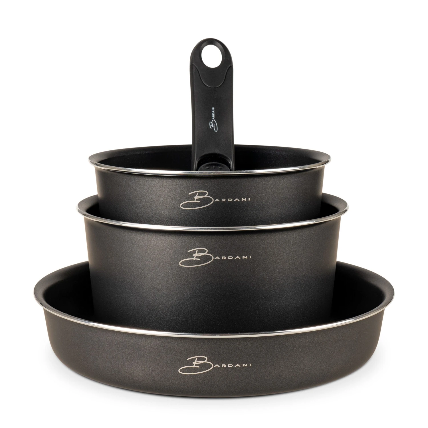 De Bardani Panna pannenset met opbergtas 3-delig zijn voorzien van afneembaar handvat waardoor het ruimtebesparend is. Deze Bardani pannenset bestaat een koekenpan en twee steelpannen, de pannen hebben een diameter van 16 centimeter, 18 centimeter en 24 centimeter. De pannen zijn gemaakt van lichtgewicht aluminium en dankzij de krasvrije keramische anti-aanbaklaag zijn ze gemakkelijk schoon te maken. De pannen zijn geschikt om te gebruiken op gas maar kunnen ook op een keramische-, elektrische-, en halogeen kookplaat.
