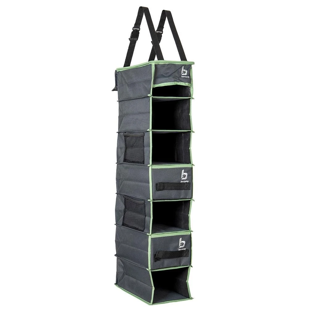 Deze Bo-Camp organizer heeft 7 ruime opbergvakken en 4 kleinere mesh zijvakken. In de 7 opbergvakken kunt u eventueel lades schuiven met een afmeting van 29 x 16 x 11 centimeter. De Bo-Camp opvouwbare organizer wordt geleverd inclusief materiaal voor bevestiging. Zo kunt u de organizer door middel van de meegeleverde pees bevestigen aan de caravanrail, of kunt u deze met klittenband of straps vastmaken aan een tentstok. Daarnaast zitten er zeilogen bij voor ophanging aan haken. Aan de onderkant van de organizer zitten lussen om de organizer extra vast te zetten. De Bo-Camp opvouwbare organizer 7-vaks is gemaakt van super stevig 600D Polyester.