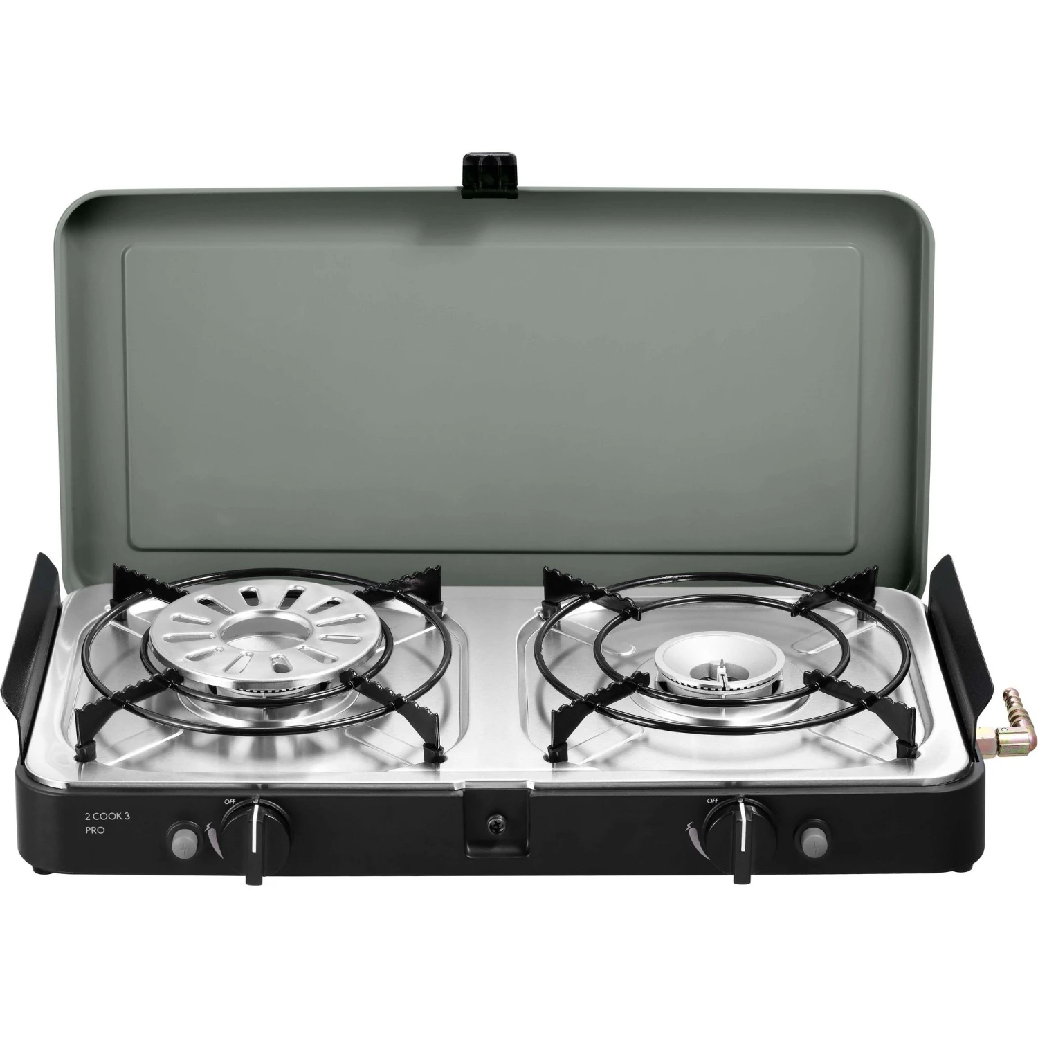 Met het 2-Cook 3 Pro Deluxe 30mbar kooktoestel kookt u binnen no time heerlijke gerechten. Het kooktoestel is uitgerust met twee stabiele pannendragers die tegelijkertijd genoeg ruimte bieden voor twee pannen. De twee branders zijn allebei gelijktijdig apart te gebruiken. Zo kunt u lekker water koken aan een zijde en ei met spek aan de andere. De onderzijde is voorzien van antislip pootjes voor extra stabiliteit. De deksel kan gebruikt worden als windscherm of om het toestel correct af te sluiten. Het kooktoestel is inclusief pandragers, bakplaat, grillplaat, percolator houder, windschermen en draagtas..