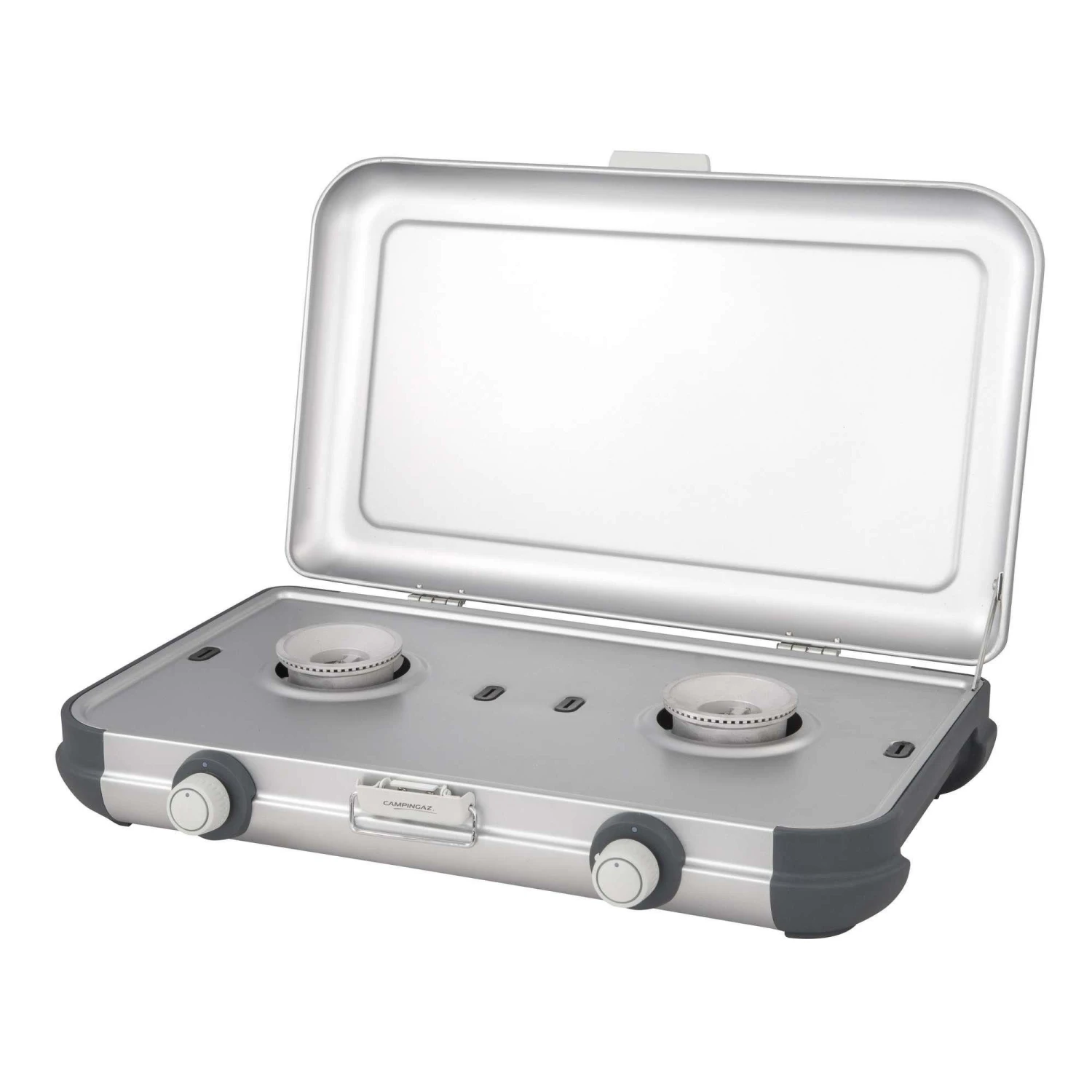 Het Campingaz Camping Kitchen 2 CV kooktoestel is geschikt voor weekendjes weg, uitstapjes of vakanties. Het kooktoestel is licht, draagbaar en heeft twee pitten. Het platte model is ruimtebesparend. Het kooktoestel heeft een robuuste stalen deksel en hittebestendige zijpanelen. Deze zijpanelen van geëmailleerd staal zijn vaatwasserbestendig en bieden daarnaast bescherming tegen wind. Het toestel is geschikt voor twee pannen met een diameter van 24 centimeter. De Easy Clic PLUS aansluiting zorgt ervoor dat patronen gemakkelijk geplaatst en verwijderd kunnen worden.