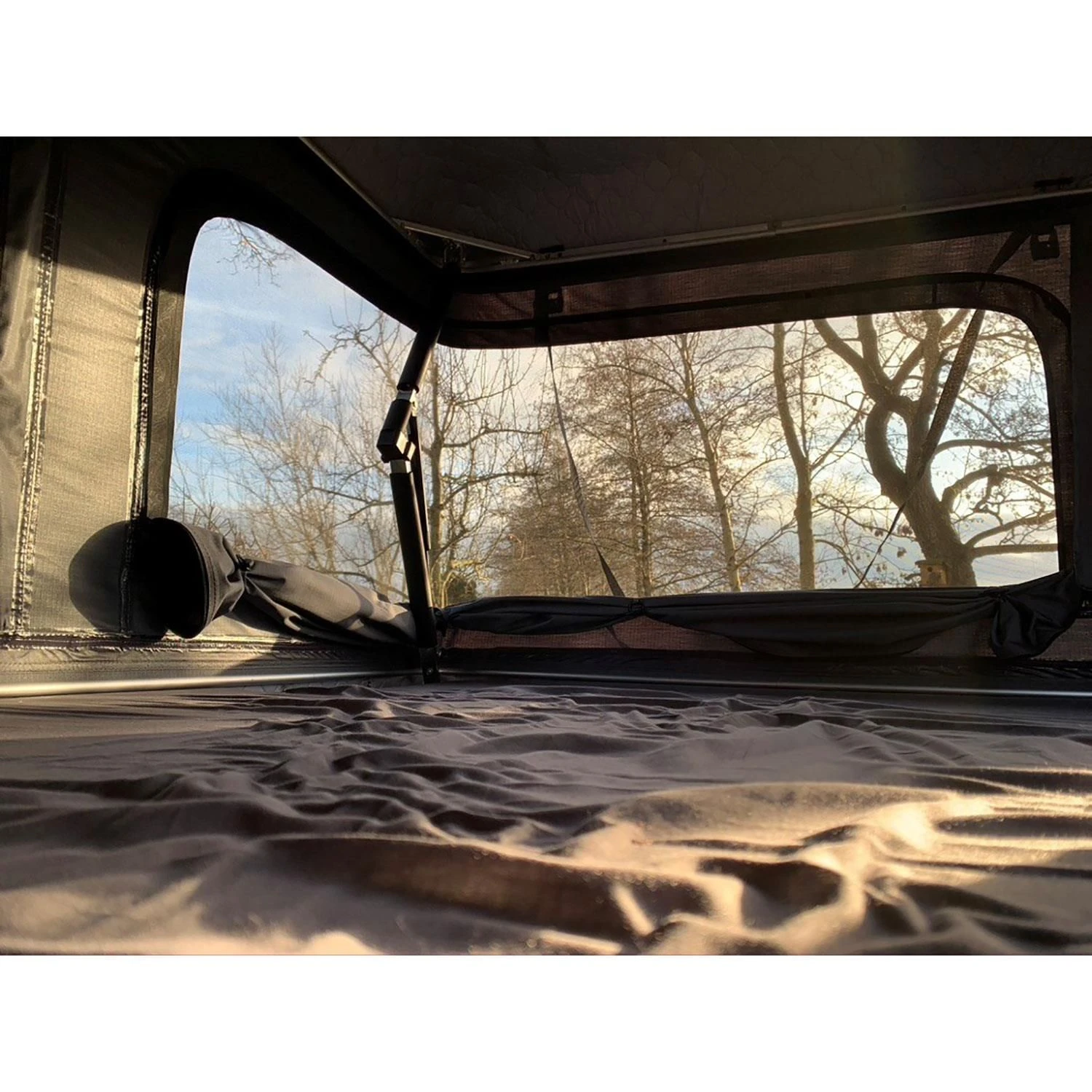 De daktent is voorzien van twee grote ramen aan het hoofd- en voeten einde. Verder is de tent uitgerust met twee deuren. Bij zowel de deuren als ramen is er zeer fijn muggengaas in verwerkt, waardoor insecten op afstand blijven. Wanneer u een raam of deur te allen tijde op een kiertje laat staan kunt u profiteren van permanente ventilatie.
