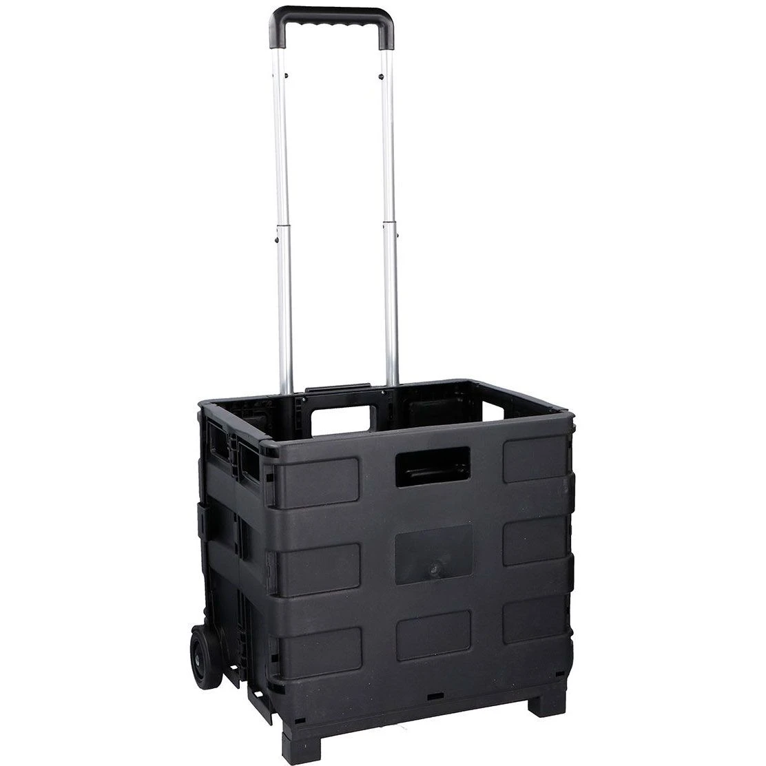 De Kinzo Opvouwbare krat met trolley is ideaal om zware boodschappen of spullen in te vervoeren. De krat is voorzien van twee rubberen wielen en een uittrekbare handgreep waardoor u de krat niet hoeft te dragen. Deze krat is eenvoudig in en uit te klappen en met de sluitingen vast te zetten. Het maximale laadgewicht is 25 kg. Het handvat is uit te schuiven tot een hoogte van 83,5 cm.