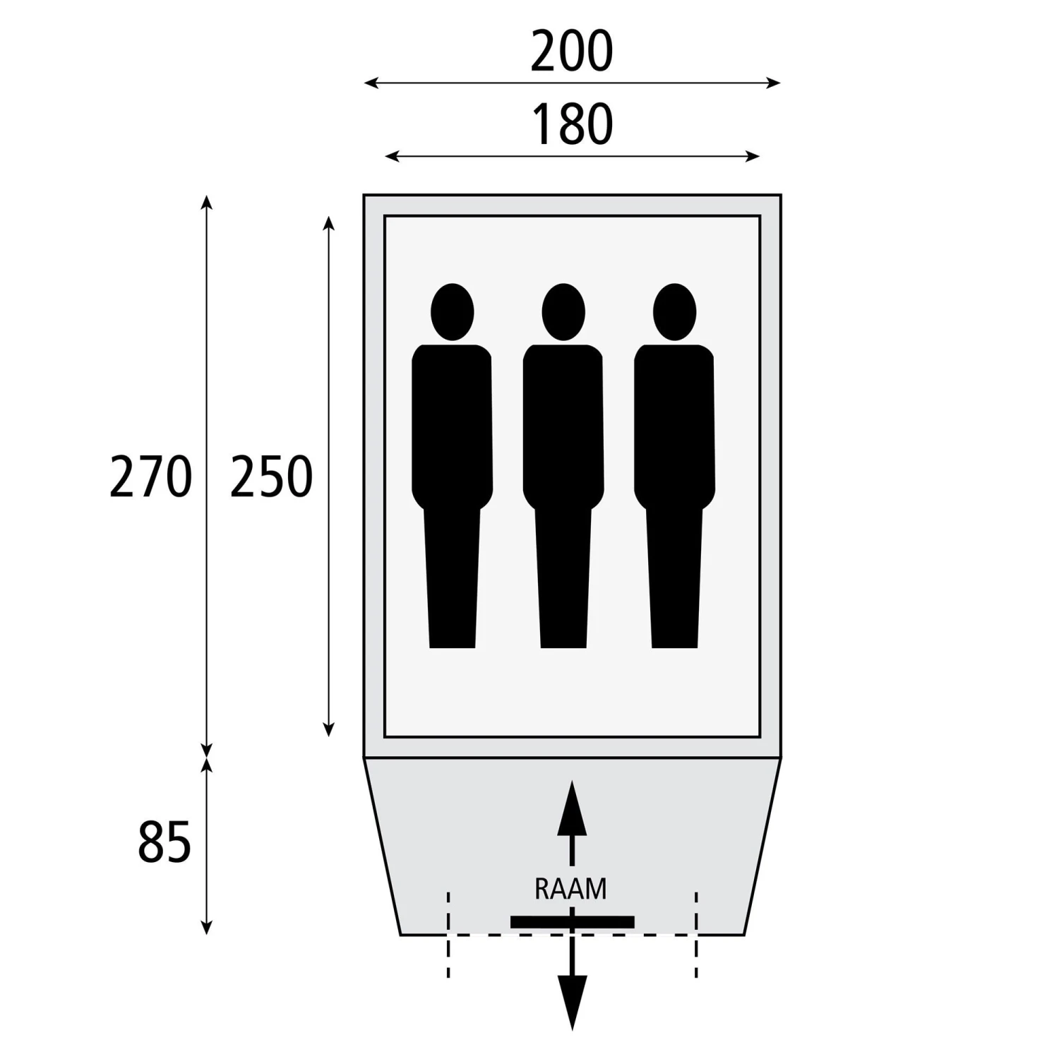 Met een lengte van 250 centimeter is de slaapcabine van de Hurricane 3 tent extra lang. De tent heeft bovendien een praktische voorbouw, handig voor bagage en schoenen. De tent wordt geleverd inclusief draagtas, haringen en scheerlijnen.