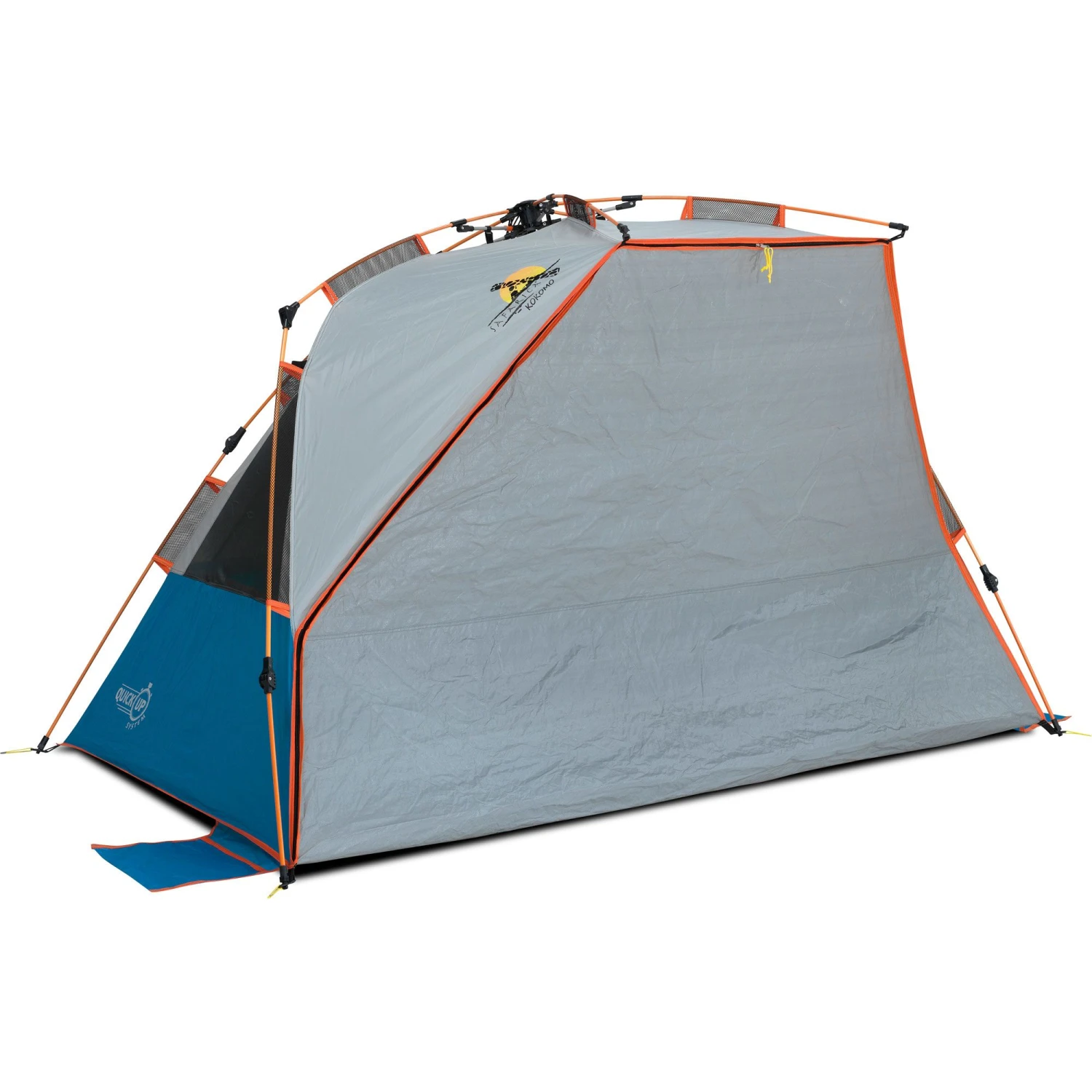 Deze strandtent is voorzien van het Quick-Up systeem. Door dit systeem kunt u dit model razendsnel opzetten. De glasfiber stokken zijn eenvoudig uit te vouwen waarna u gebruik maakt van het paraplusysteem. Deze tent heeft een afmeting van 250 x 240 cm. Het grondzeil is aan de tent vast te ritsen waardoor de tent afgesloten wordt. De tent heeft een hoogte van 120 cm en weegt slechts 2,5 kg. Hierdoor is dit model eenvoudig mee te nemen.