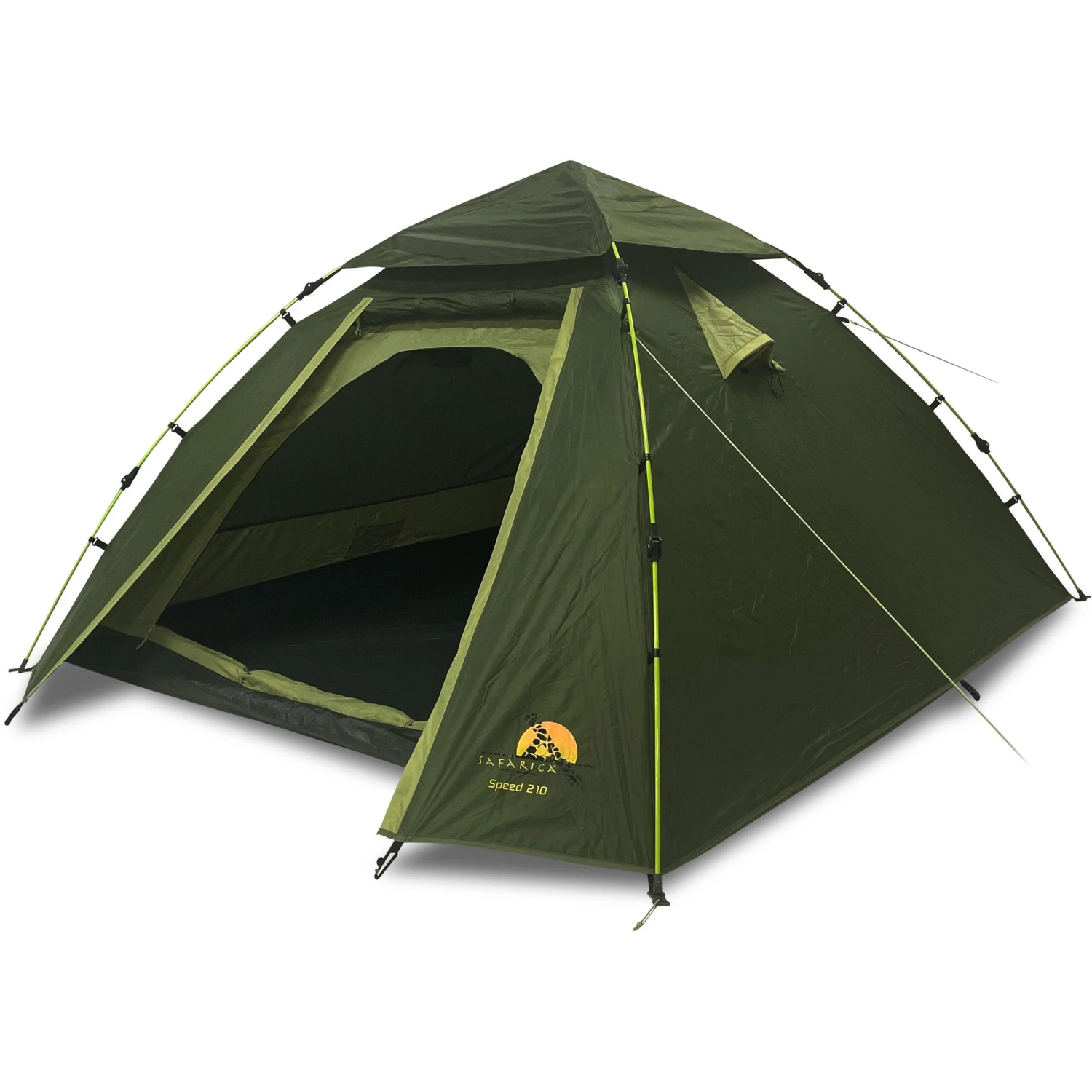 De Safarica Speed 210 Quick up paraplutent is een compacte 2-3 persoons tent die supersnel op te zetten is dankzij het paraplu opzet systeem. Het buitendoek is gemaakt van sterk polyester met PU coating. De binnentent is gemaakt van ademende materialen en het PE-grondzeil zorgt voor een verbeterde ventilatie. De paraplutent is voorzien van handige opbergvakken in de binnentent, en voorin van een bagagepunt. Deze tent wordt geleverd inclusief draagtas, haringen en scheerlijnen.