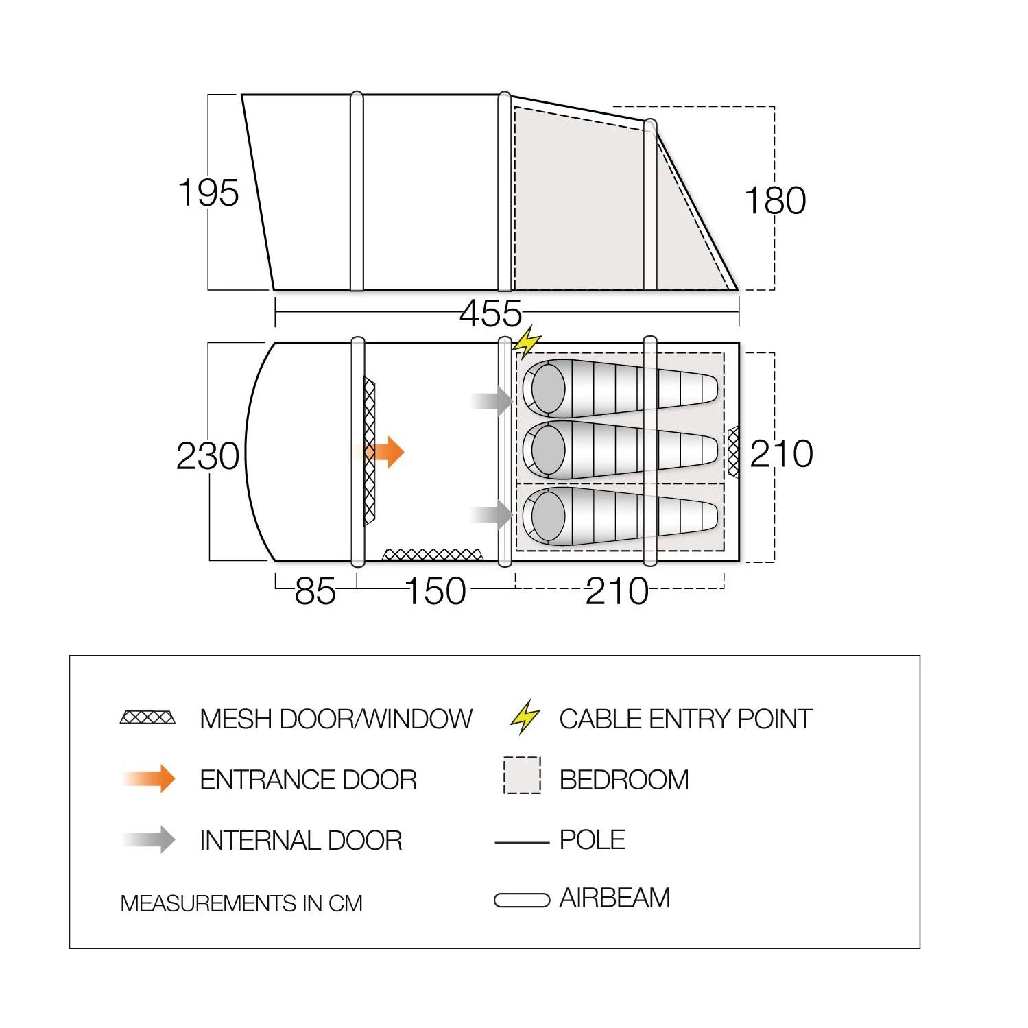 De tunneltent heeft een slaapcabine die u kunt scheiden met de scheidingswand. De binnenkant van de slaapcabine heeft een verduisterend doek dat zo min mogelijk licht binnen laat. De tent is voorzien van ventilatie panels die de luchtcirculatie op goed niveau houdt binnen de tent. De leefruimte is ruim en biedt voldoende opbergruimte voor uw spullen. De ramen laten veel licht door en hebben allemaal horrengaas. Hiermee kunt u de tent extra laten luchten terwijl ongedierte buiten blijft.