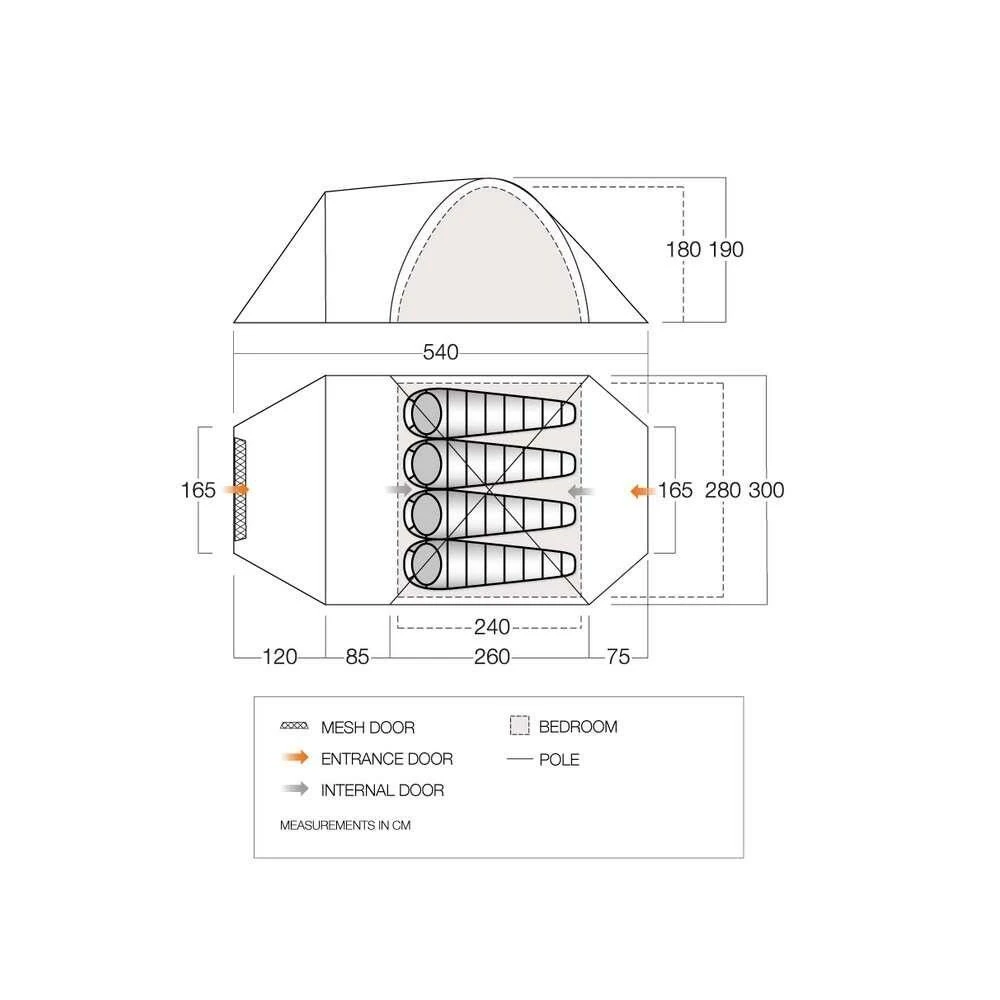 De tent is dankzij het Sentinel polykatoen materiaal geschikt voor warmere en koelere omstandigheden. De tent is gemakkelijk en snel op te zetten, omdat de binnentent al bevestigd is. Het gekoppeld grondzeil is makkelijk te bevestigen of los te maken van het woongedeelte. Het grondzeil is daarnaast waterdicht en slijtvast. De glasvezelstokken creëren sterk licht en een betrouwbare constructie. De donkere slaapcabine van 240 x 280 centimeter biedt ruimte voor 4 personen en verminderd het licht in de ochtend voor een comfortabele nachtrust.